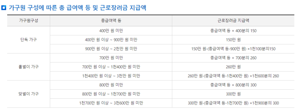 그래서 처음에 말씀드렸던 소득 기준이 각각 해당하는 금액보다 넘지 않아야 근로장려금을 받을 수 있는데요.