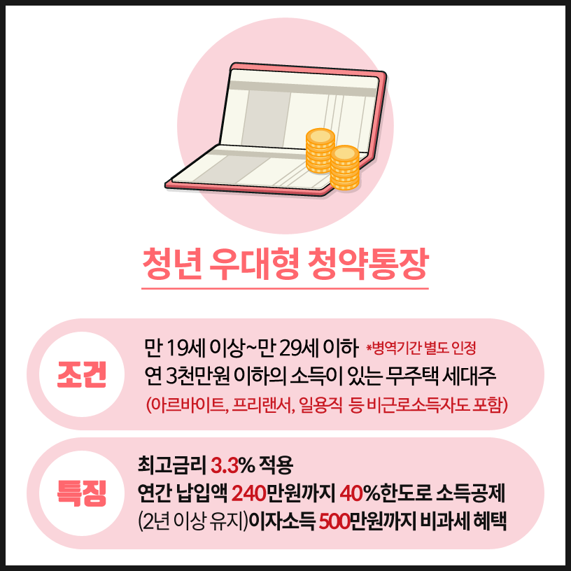 그중에서도 이 청년 우대형 주택 청약 저축 같은 경우에는 청약을 하기 위해서 꼭 필요한 어떤 그런 통양 통장이기도 하지만, 저 해당 저축에서 2023년 12월 31일까지 이 저축을 가입하는 경우에는 해당 저축에서 발생한 이자 소득에 대해서 최대 500만 원까지 소득세를 부과하지 않겠다는 세제 혜택을 두고 있습니다.