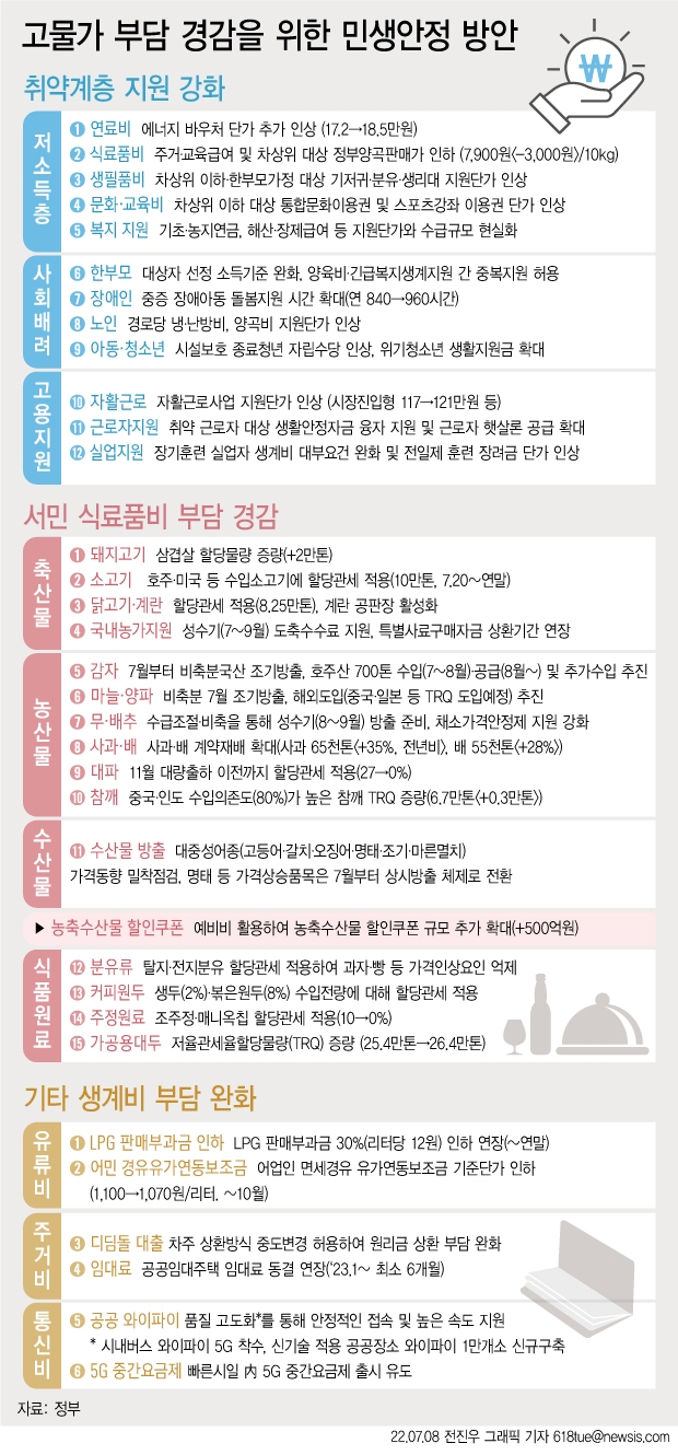 소비자물가 상승률이 6%대로 치솟자 정부가 8000억원 규모의 추가 민생 대책을 발표했습니다. 취약계층 재정지원을 늘리고, 식비 등 생계비 부담을 덜어주는 방안이 포함되었는데요, 이번 2022년 하반기부터 저소득 추가 지원 정책이 대략 15가지를 설명드리겠습니다. 하나씩보시면서 필요한 부분은 신청해주시면 됩니다~