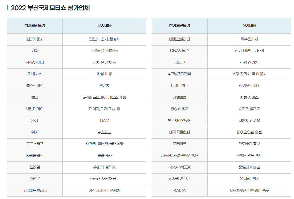 이번 2022 부산 국제 모터쇼 참가업체 리스트 입니다.