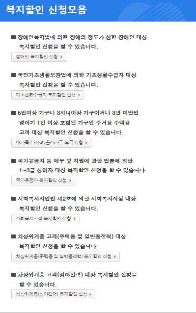 이렇게 장애인 유공자 기초생활 수급자 등 복지할인 대상이시거나 만약에 우리 집이 대가족이다.