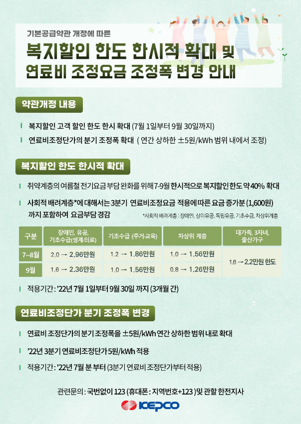 이런 분들을 위하여 한전에서 기본 공급 약관 개정에 따른 복지 할인 한도 한시적 확대 및 연료비 조정 요금 조정폭 변경 지원하는 사업입니다.