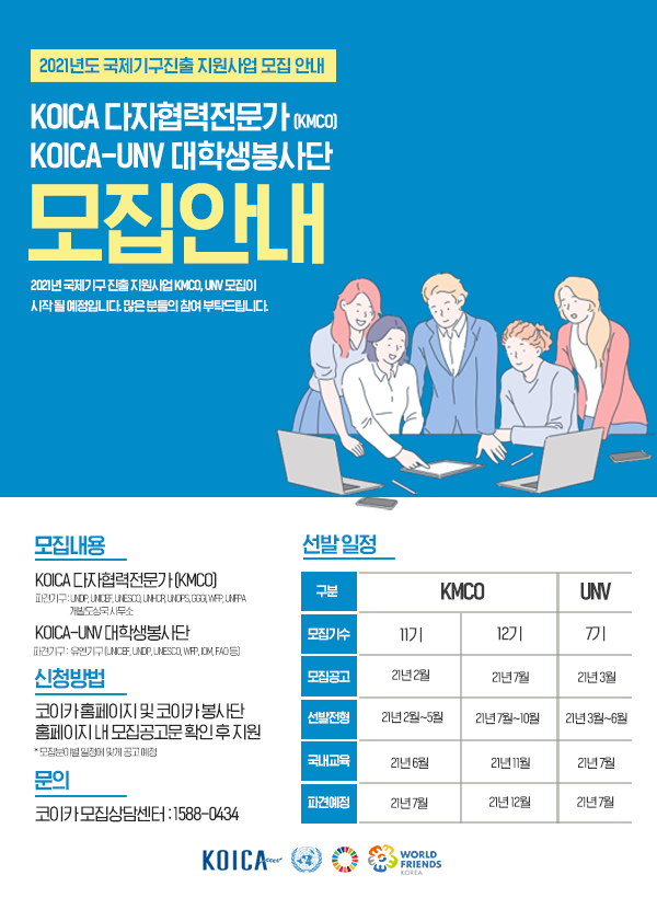 - (개요) KOICA와 KMCO 파견에 관한 MOU를 체결한 국제기구 대상 우리 국민 파견을 지원하여 △KOICA 사업효과성 제고, △국제기구와의 상시 협력채널 구축, △개발협력분야 글로벌인재 양성을 지원하며, 2021년에 총 45명 내외 선발 예정